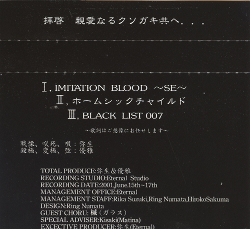 1. IMITATION BLOOD~SE~ 2. ホームシックチャイルド (Homesick Child) 3. BLACK LIST007 |